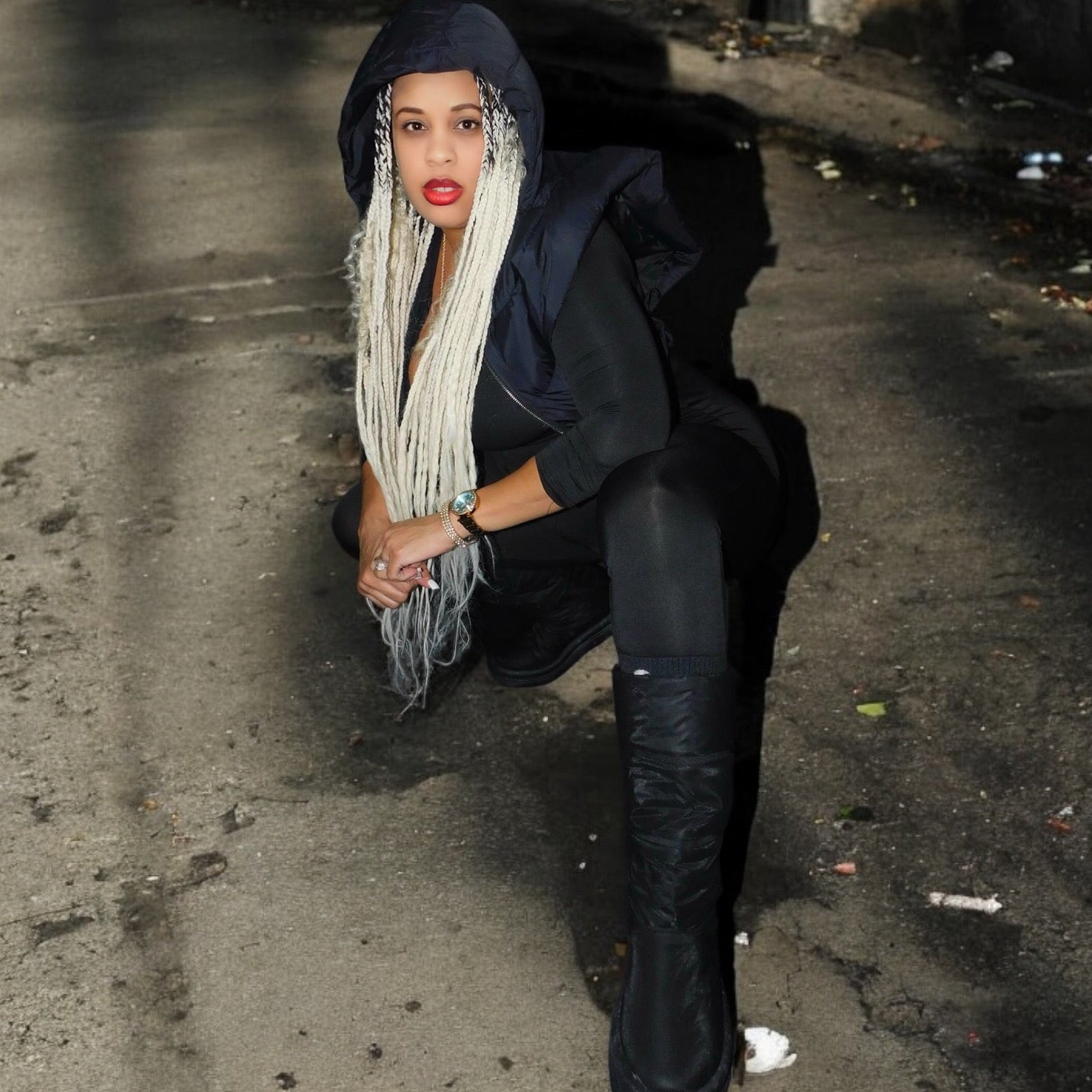 Black puffer hooded vest with zipper and ties on the side.
