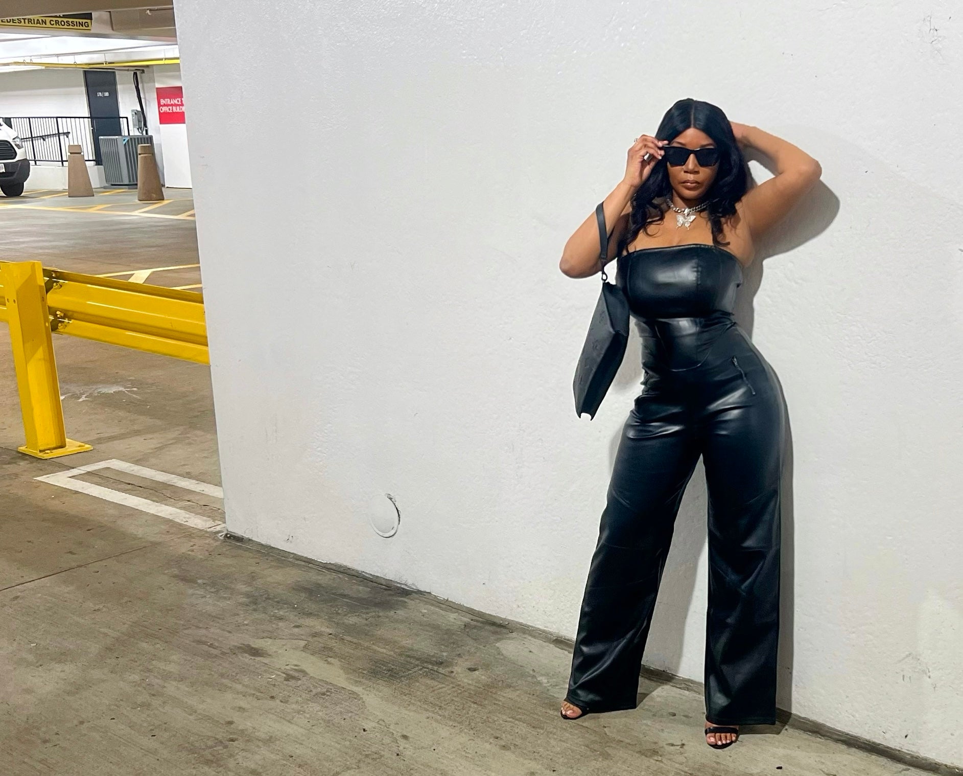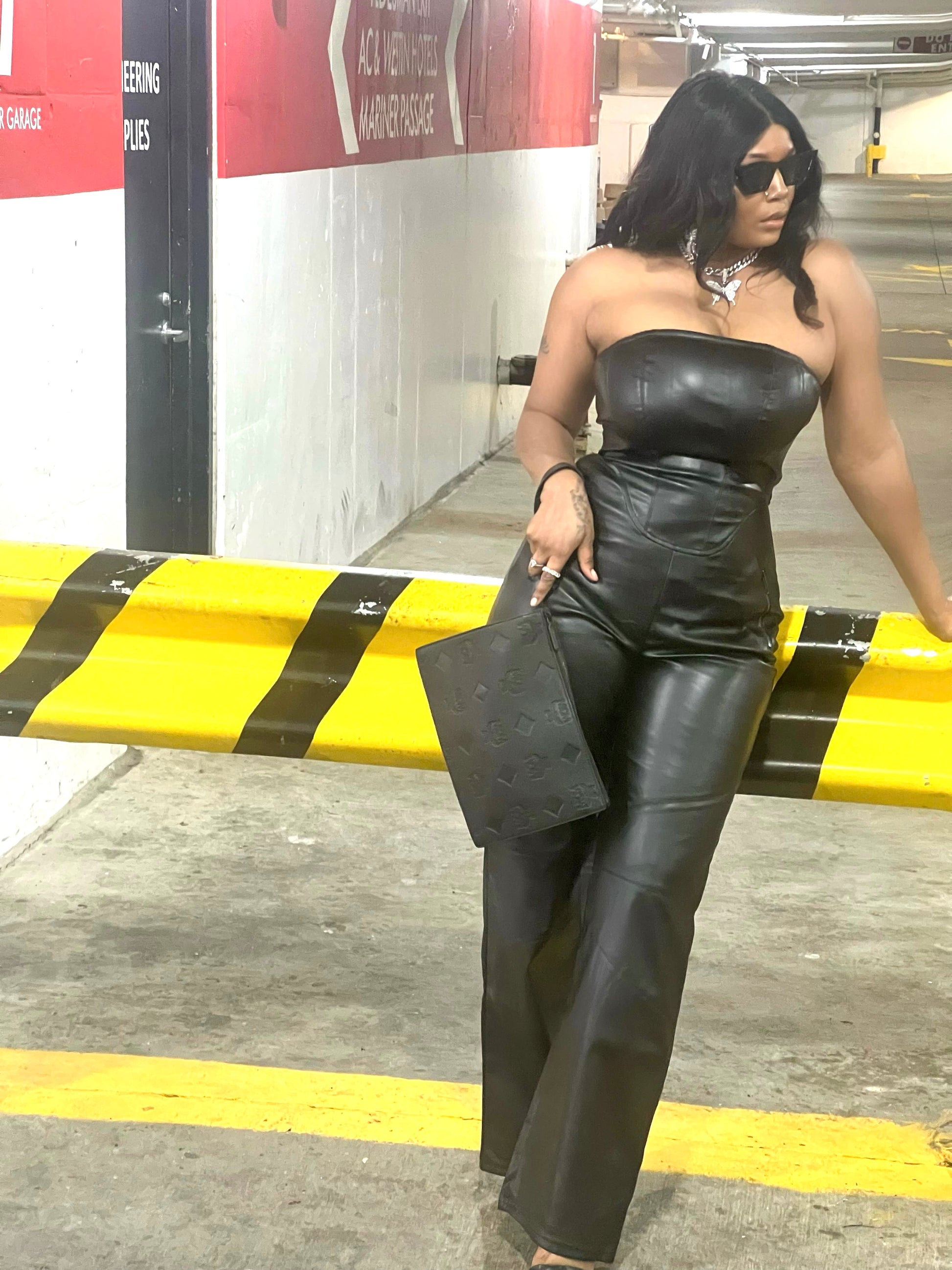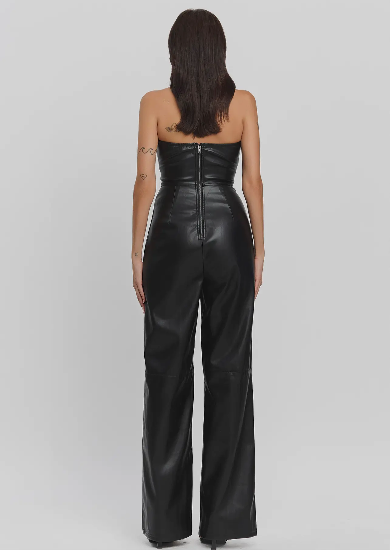 2 way stretch faux leather strapless jumpsuit with flare bottom