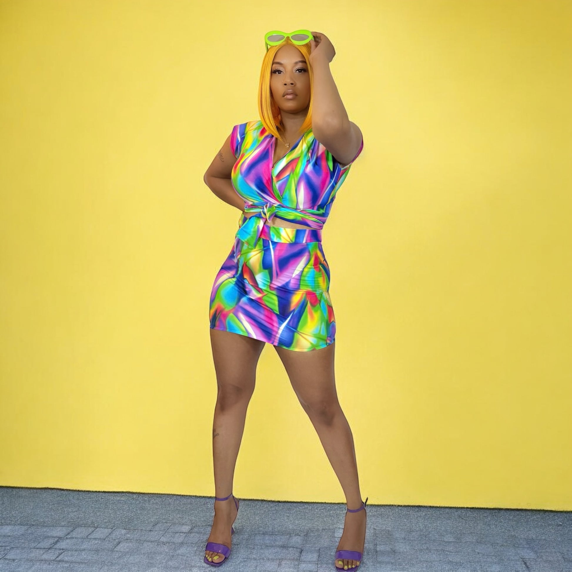 Custom made two piece set with 4-Stretch with printed paint strokes finish. Comes with a sleeveless wrap top and high-waisted mini skirt.
