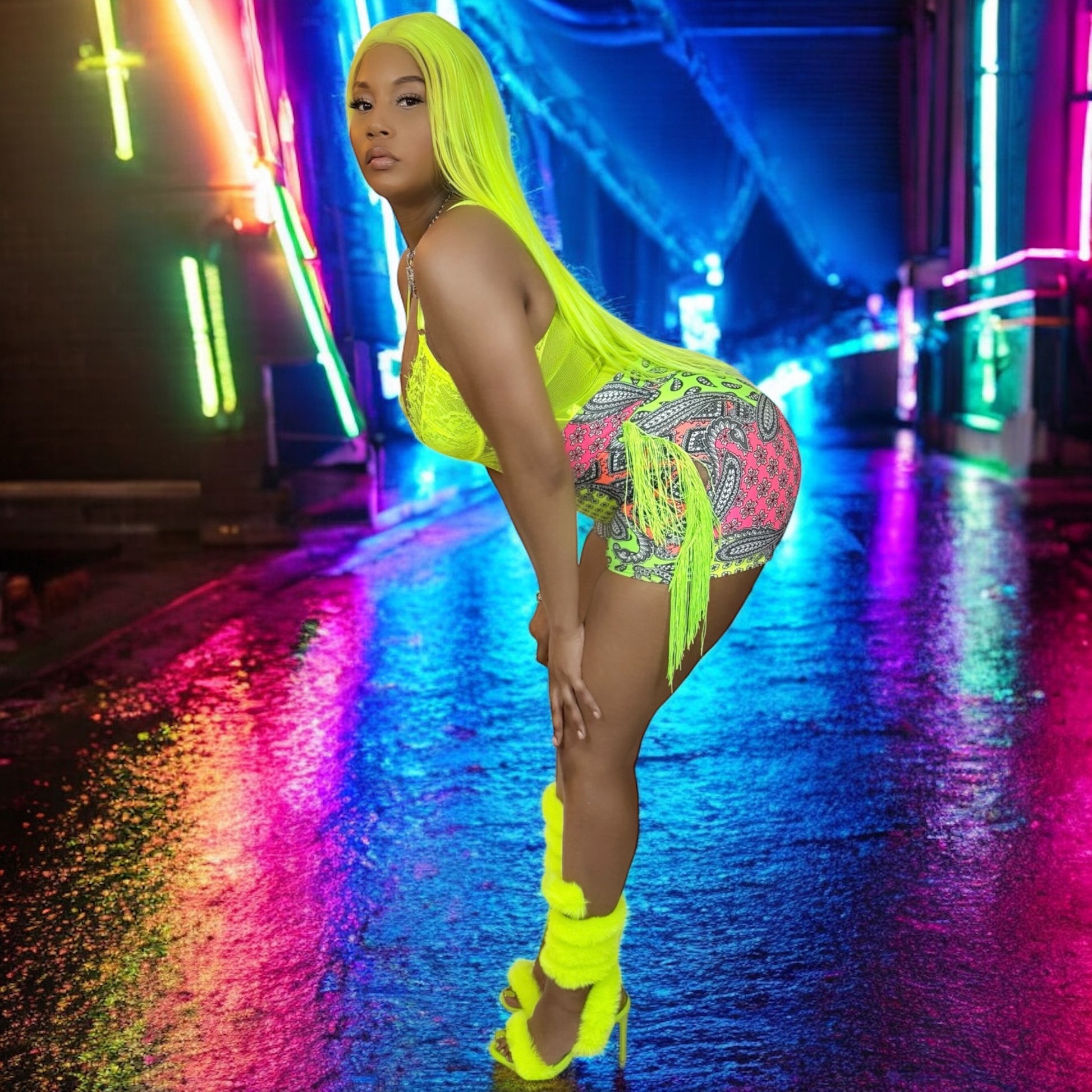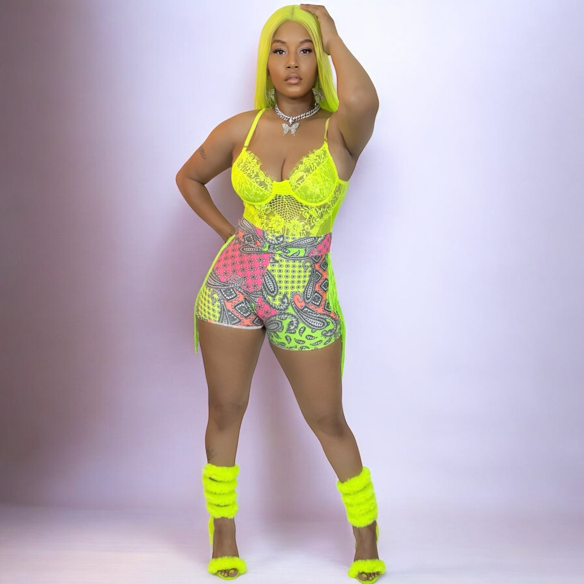 Neon paisley bandanna print 4-way stretch fringe shorts.