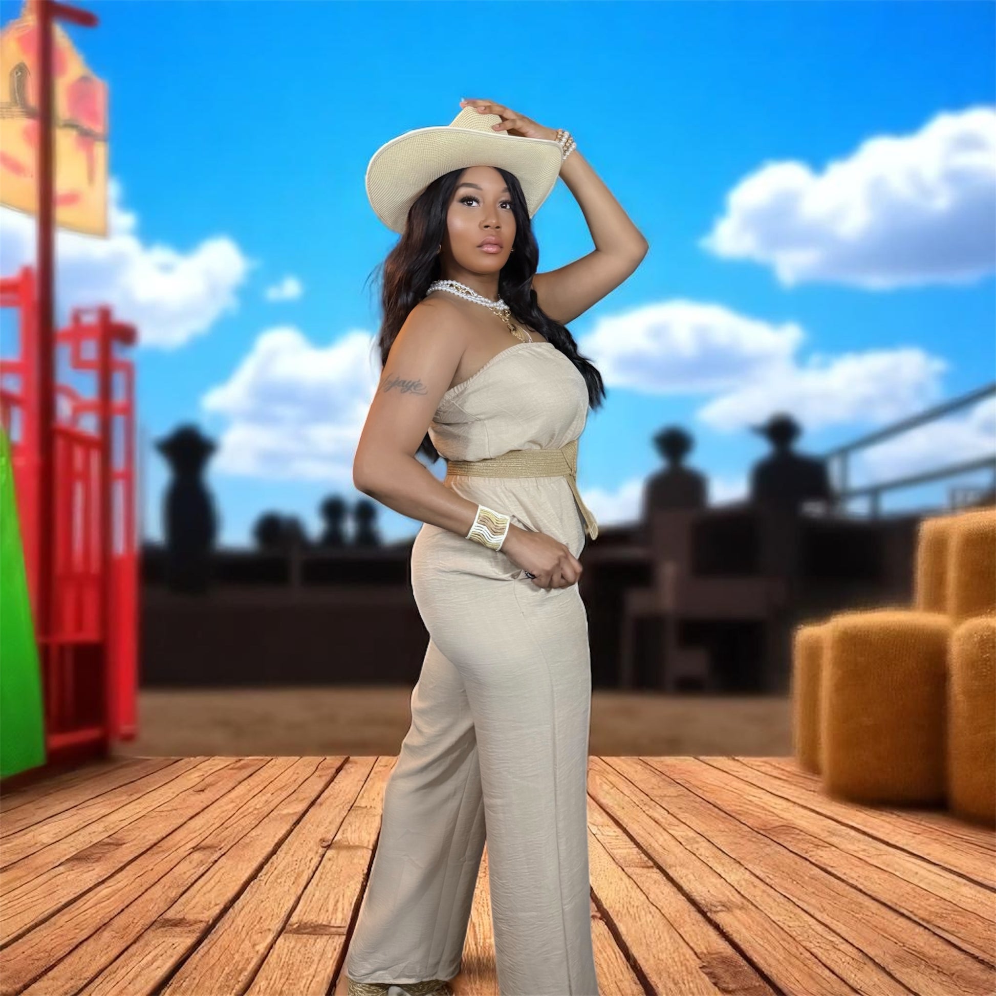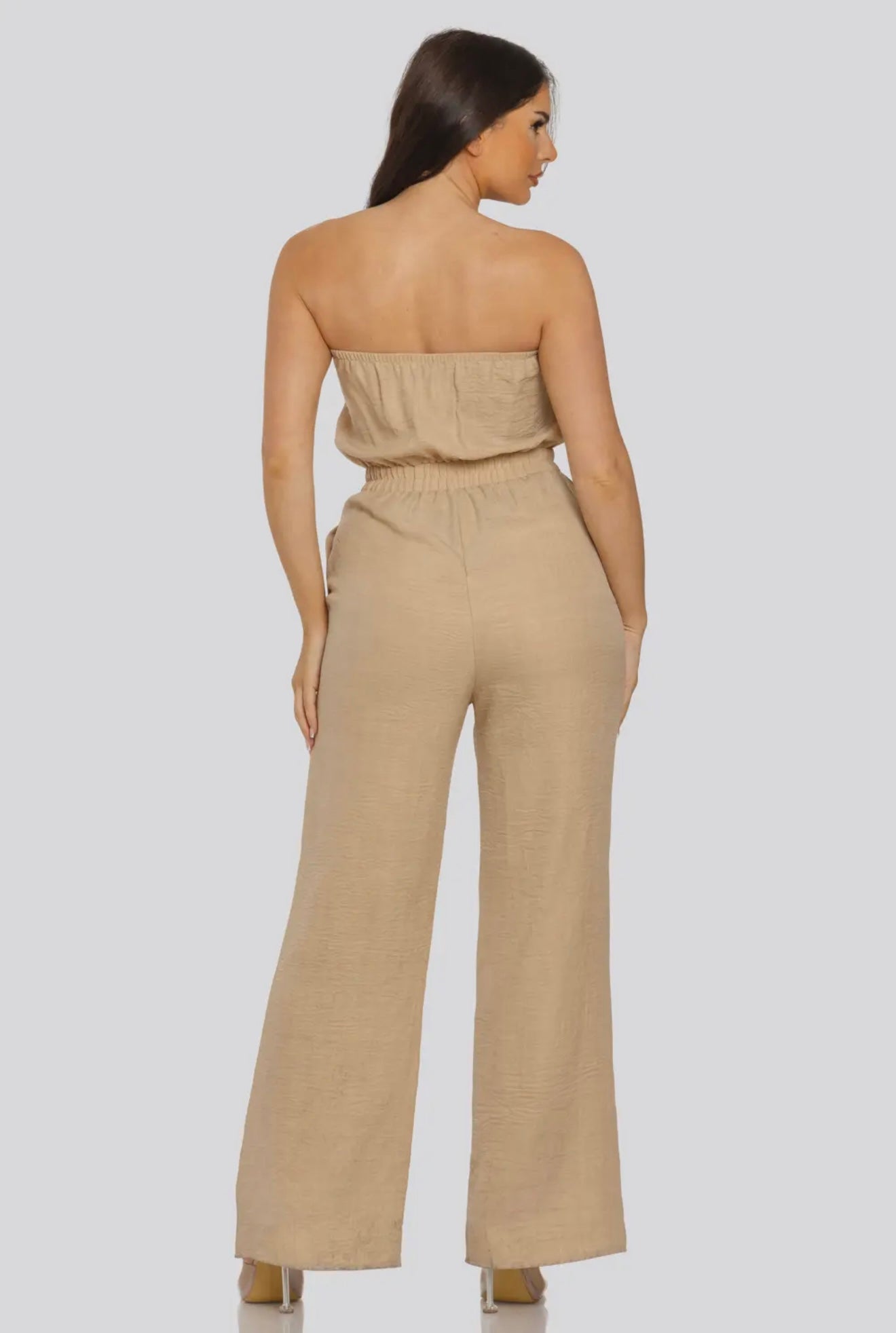 Linen solid off the shoulder elastic band chest and waistband side pockets jumpsuit.